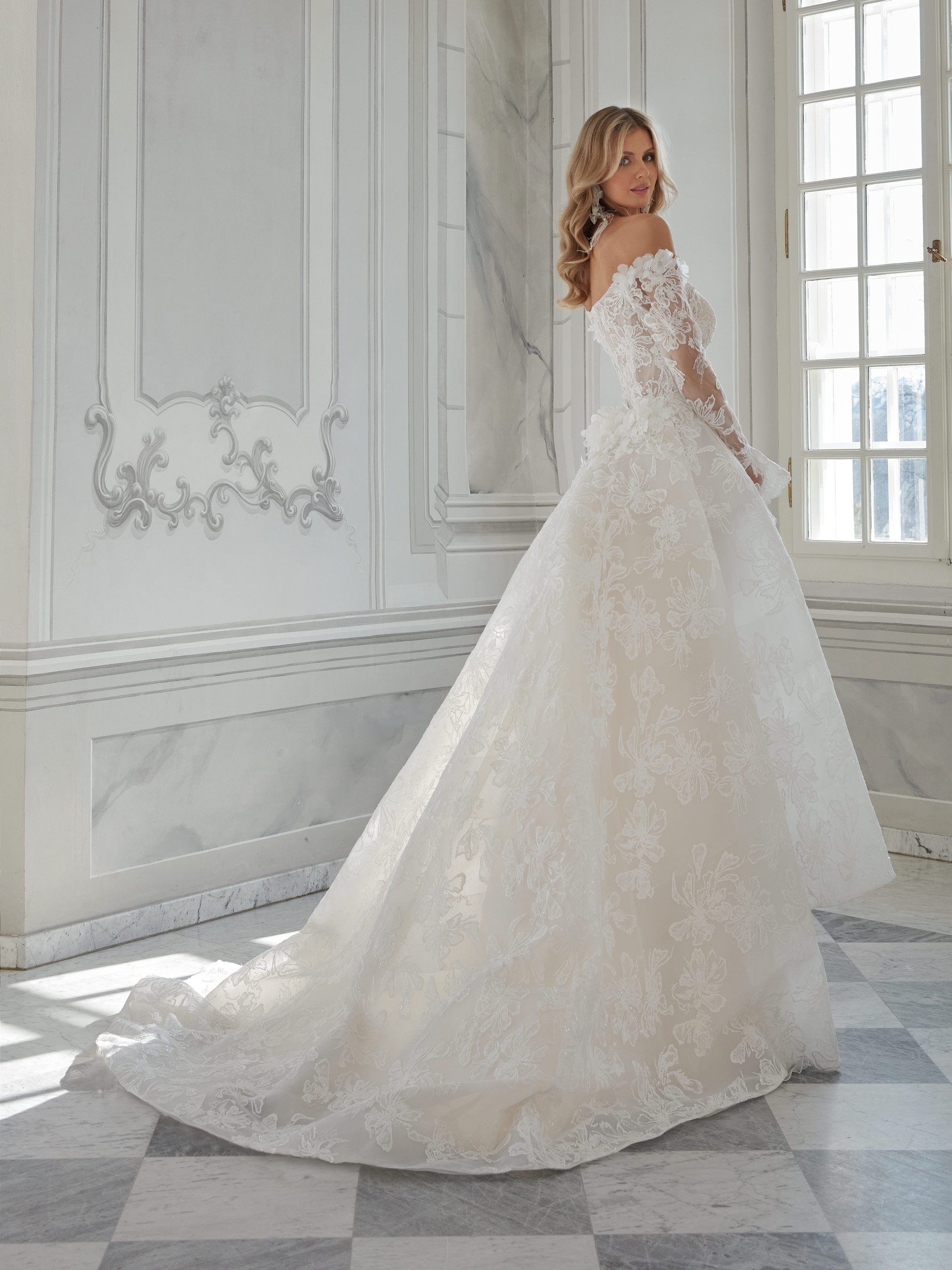 Kalani is a unique wedding dress that captivates with its bold high-low silhouette. The lace bodice with an off-the-shoulder neckline and sheer long sleeves creates a delicate, romantic feel. The front reveals the legs for a daring touch, while the dramatic train at the back adds grandeur and timeless elegance. A perfect choice for a bride who seeks to blend tradition with modern flair.