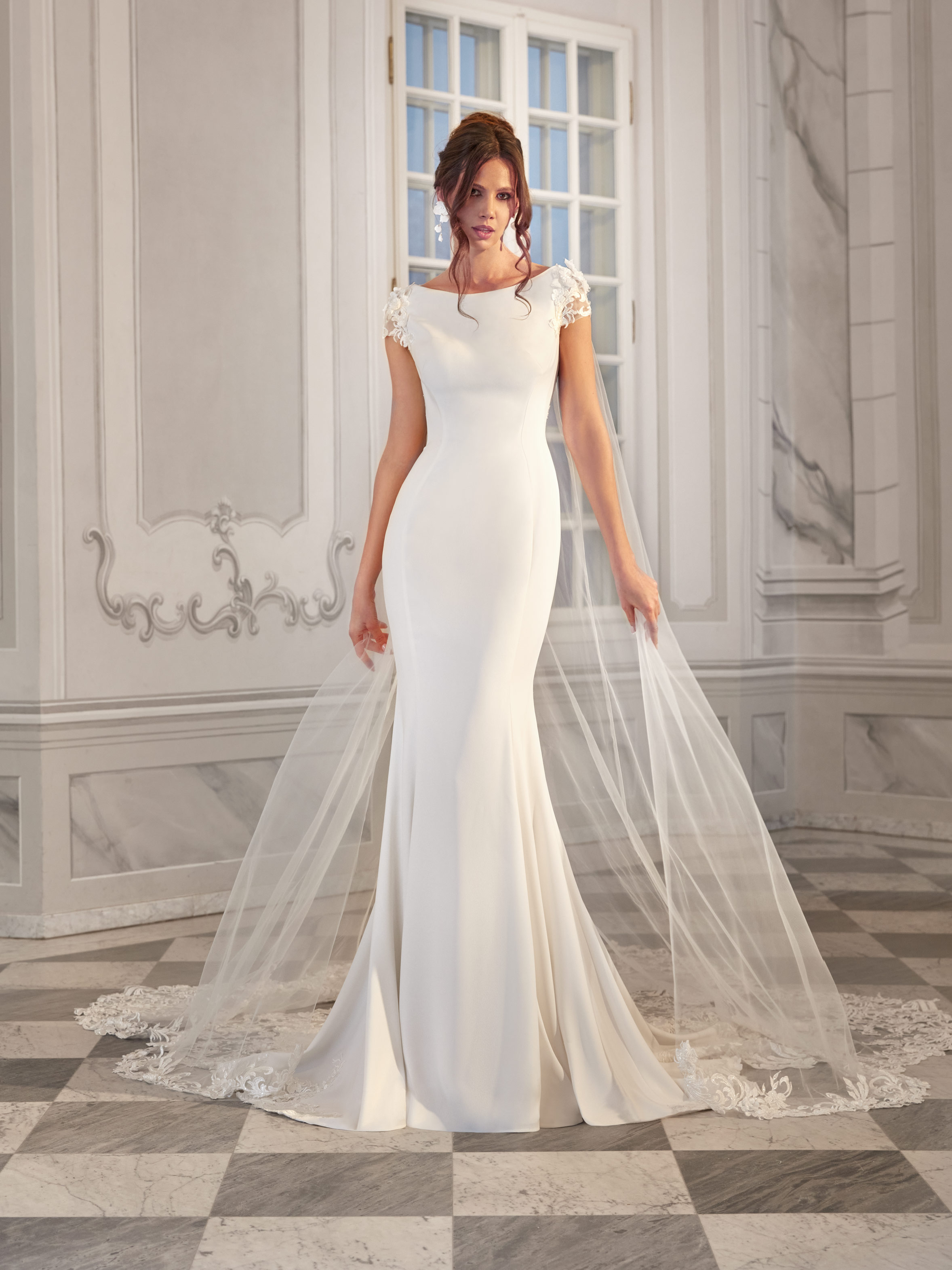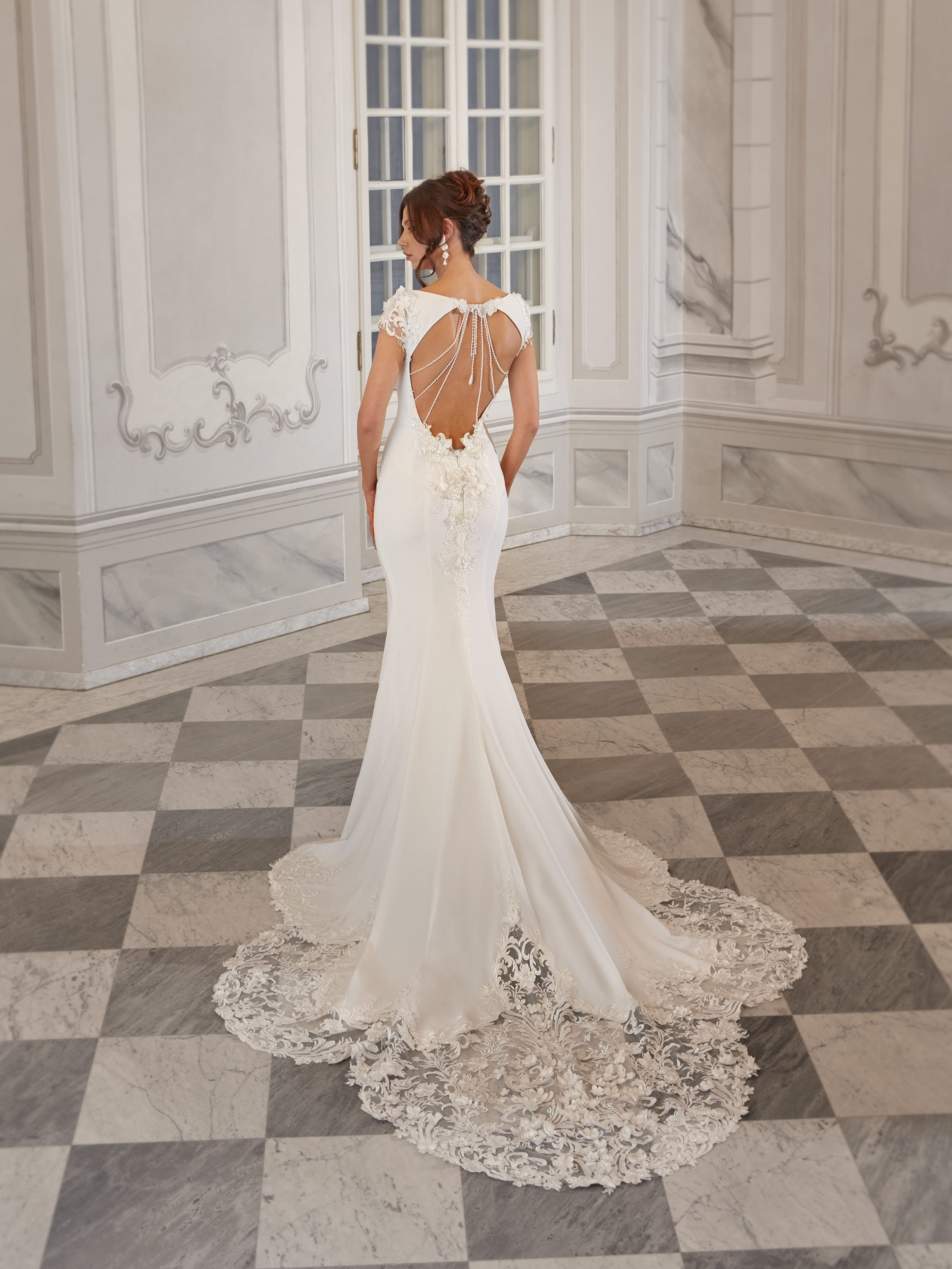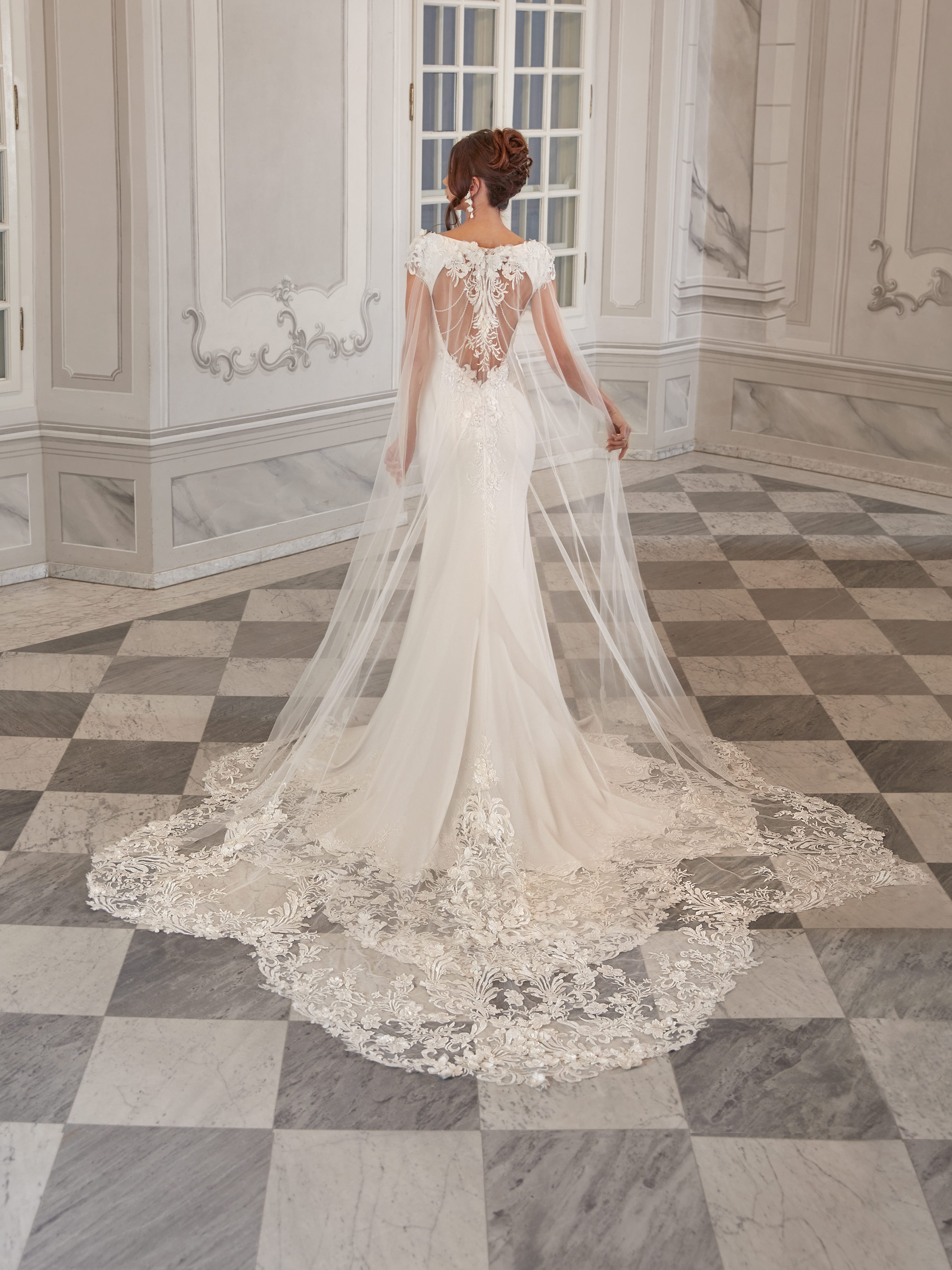 Kallie is an elegant gown with a timeless silhouette and an unexpected touch – a richly adorned open back. The boat neckline and delicate lace sleeves add sophistication, while the soft fabric gracefully embraces the figure. A sheer embroidered cape drapes gently over the shoulders, adding a dreamy and romantic finish. Perfect for a bride who values both classic elegance and unique details.