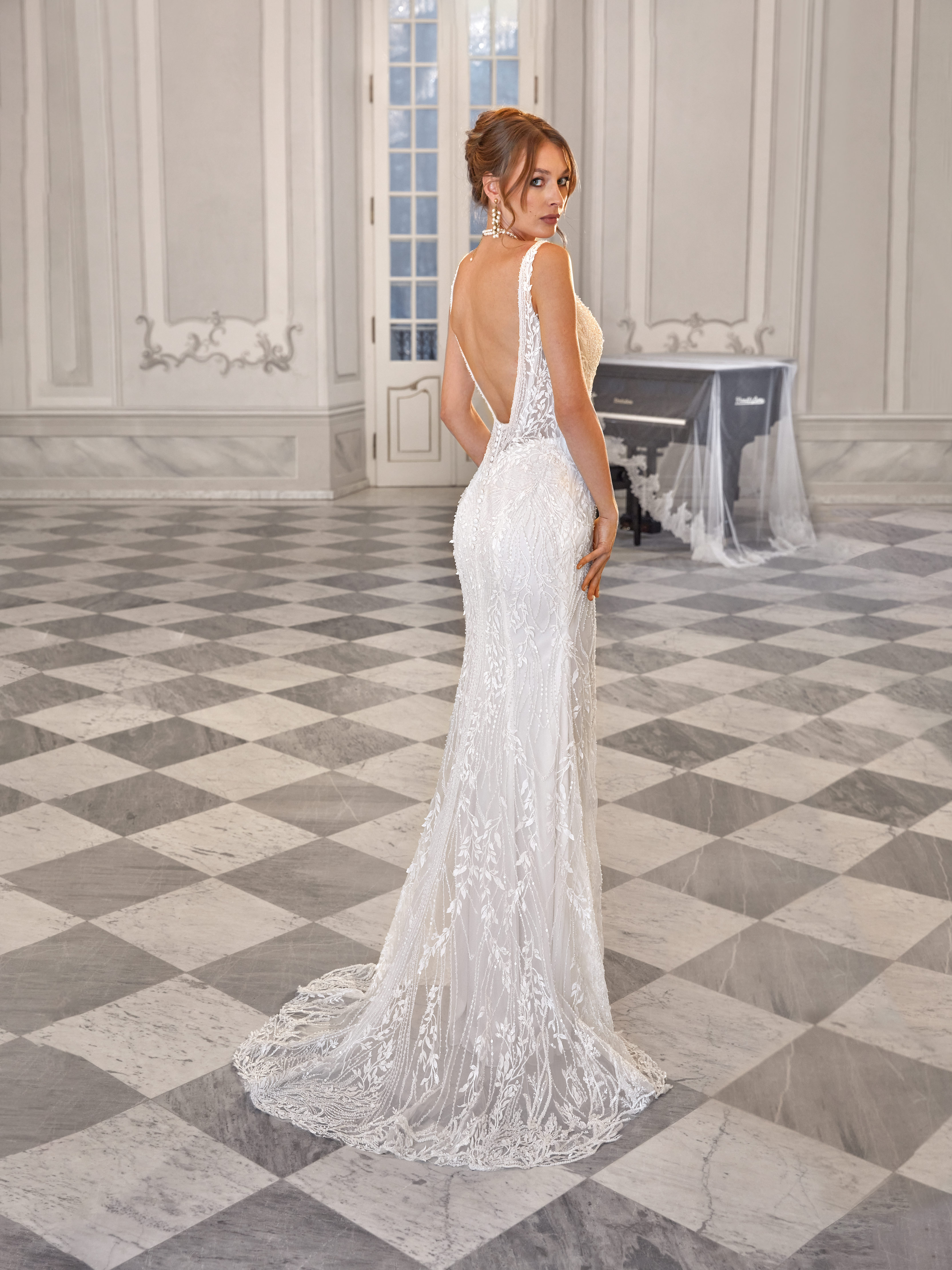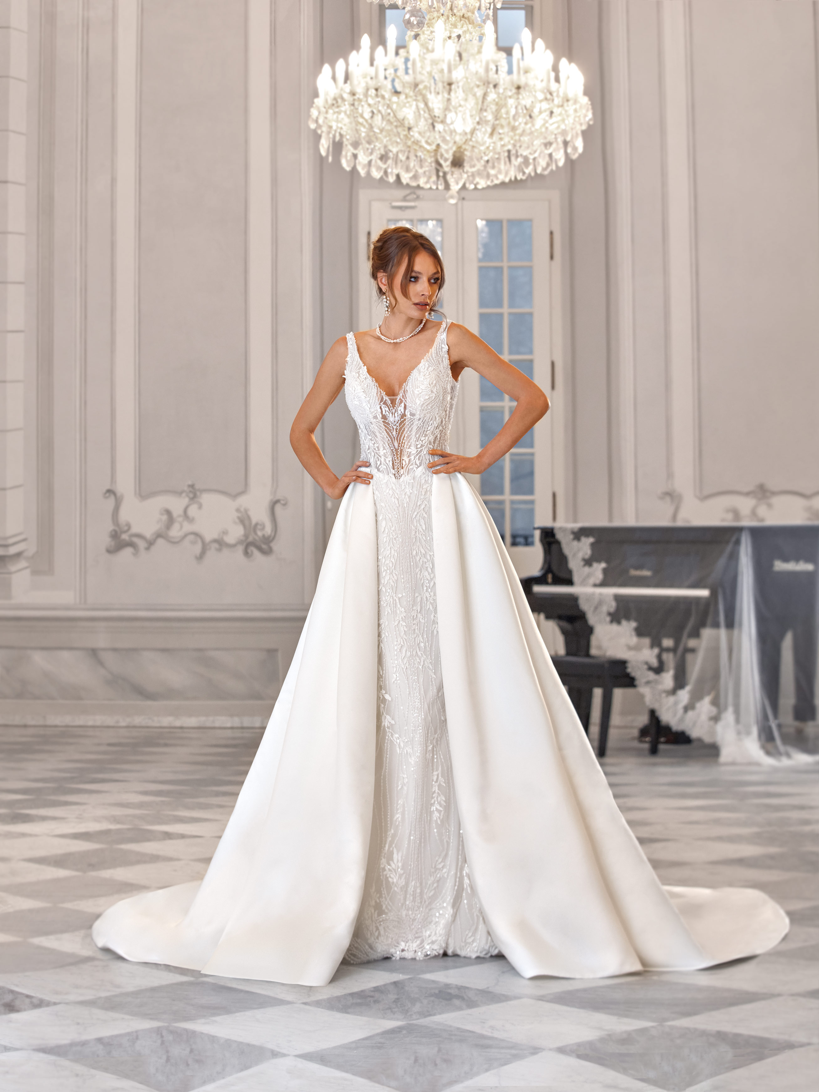Katarina is a refined fitted gown made of richly embroidered fabric with a subtle shimmer. The deep neckline with a sheer insert and softly transparent sides enhance the figure. The look is completed by a detachable full skirt with a train, adding a touch of grandeur.