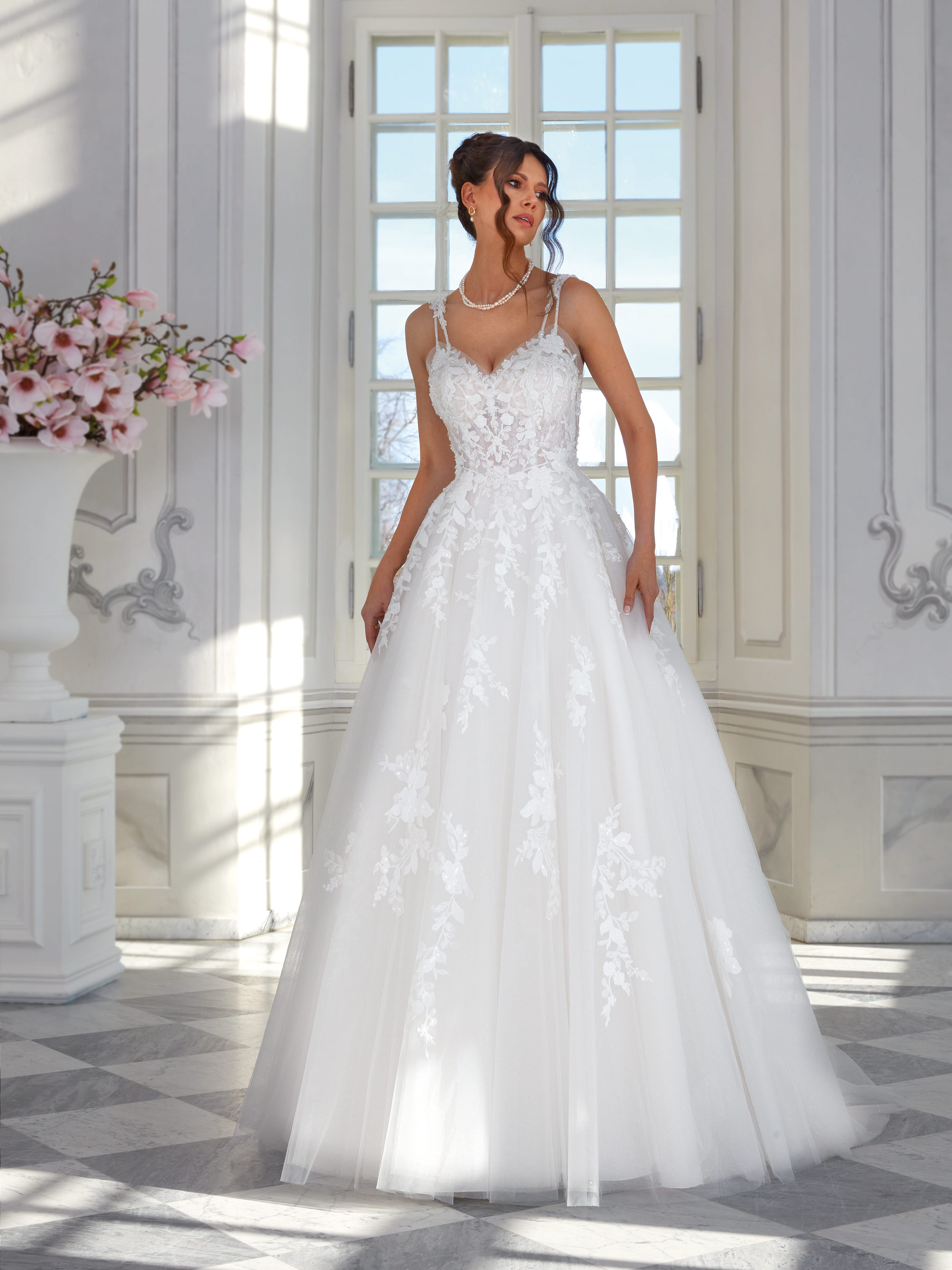 Delicate Kenna is a princess-cut gown that captivates with lightness and romance. The sheer bodice with visible boning features double thin straps, adding a modern touch. The transparent back is finished with fine lace, creating a sensual yet elegant detail. A soft, flowing train completes this graceful bridal look.