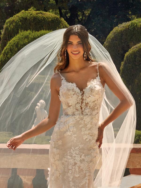 Leonora is a fitted wedding gown that exudes subtle elegance and modern charm. The lace neckline