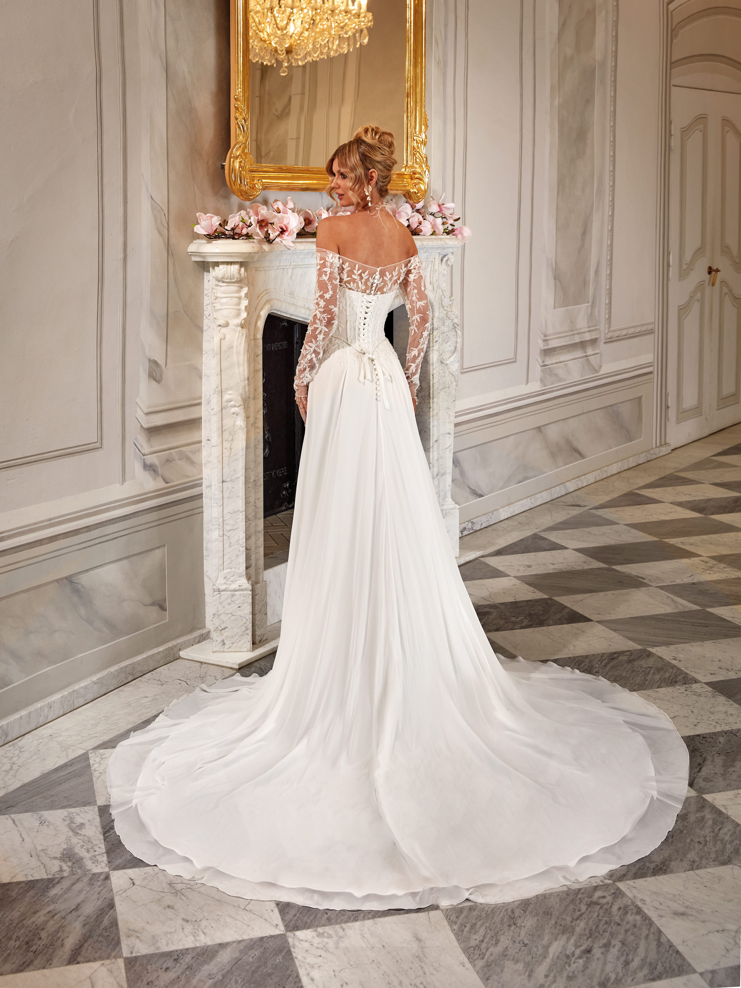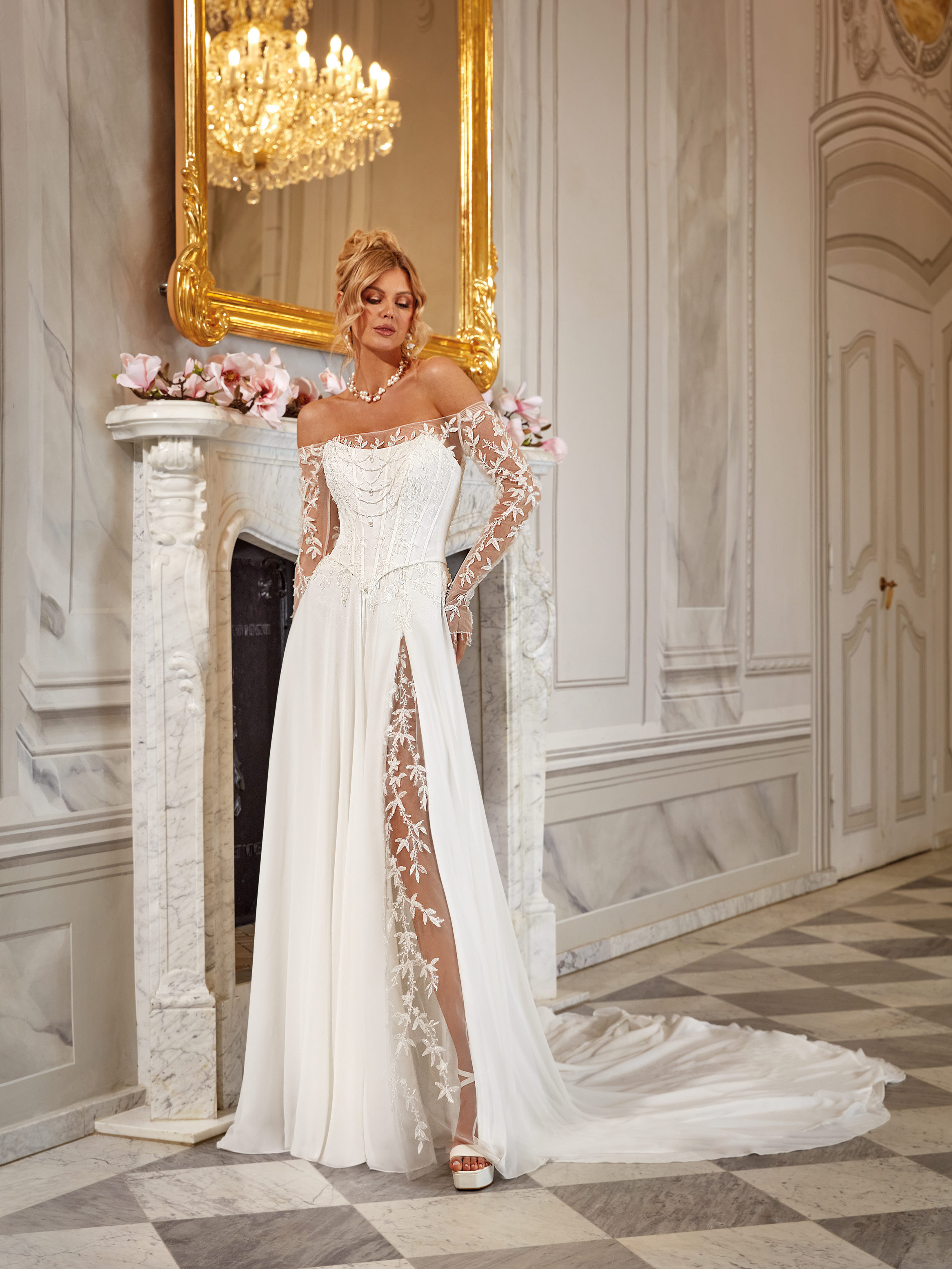 Nanette is a dazzling glamour-style wedding dress that impresses with both its detailing and structure. The off-the-shoulder bodice with long lace sleeves gracefully highlights the neckline and adds a touch of femininity. The semi-sheer skirt with a high slit reveals a delicately embroidered tulle panel, catching the eye and adding lightness to the look. A lace-up back and softly cascading train complete the regal elegance of this breathtaking gown.