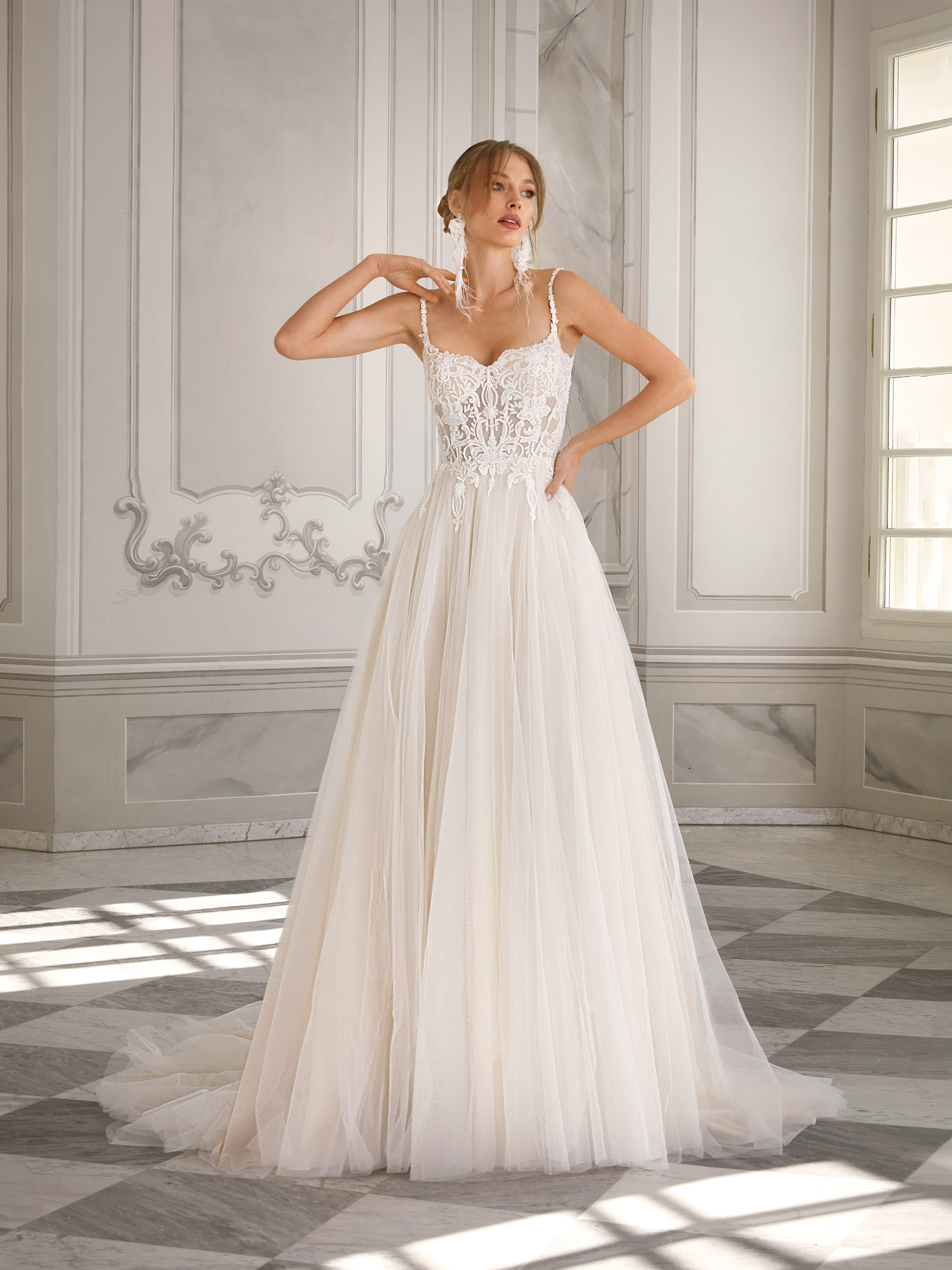 Natta is a romantic wedding gown with a light, ethereal feel. The delicate bodice, crafted from sheer lace and thin spaghetti straps, softly highlights the neckline and open back. The skirt flows in airy layers of soft tulle, creating a graceful and effortless silhouette. Classic in shape but rich in charm, Natta is perfect for the bride who seeks natural beauty and understated elegance.