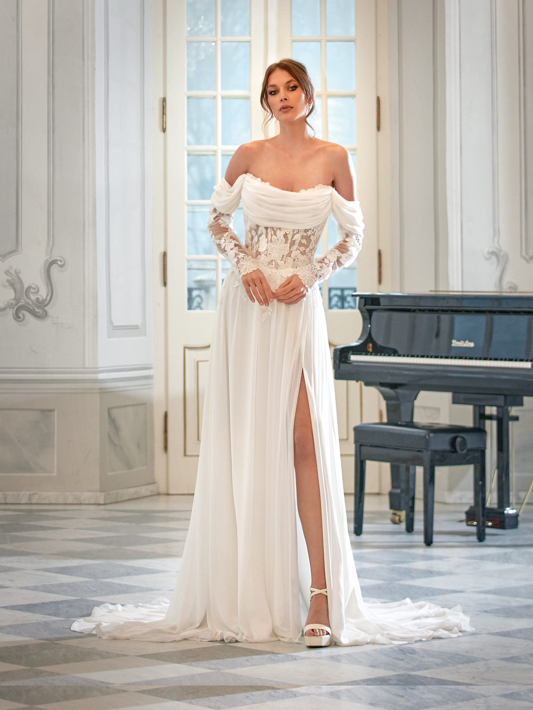 Nayeli is an exquisitely romantic wedding gown that blends timeless elegance with modern sensuality. The bodice features sheer panels and floral lace, embracing the figure and defining the waist. Draped off-the-shoulder sleeves soften the look, while the long lace sleeves bring a refined touch. The airy skirt flows effortlessly with a thigh-high slit and a delicate train. Nayeli is the perfect choice for the bride dreaming of a romantic moment with a bold twist.