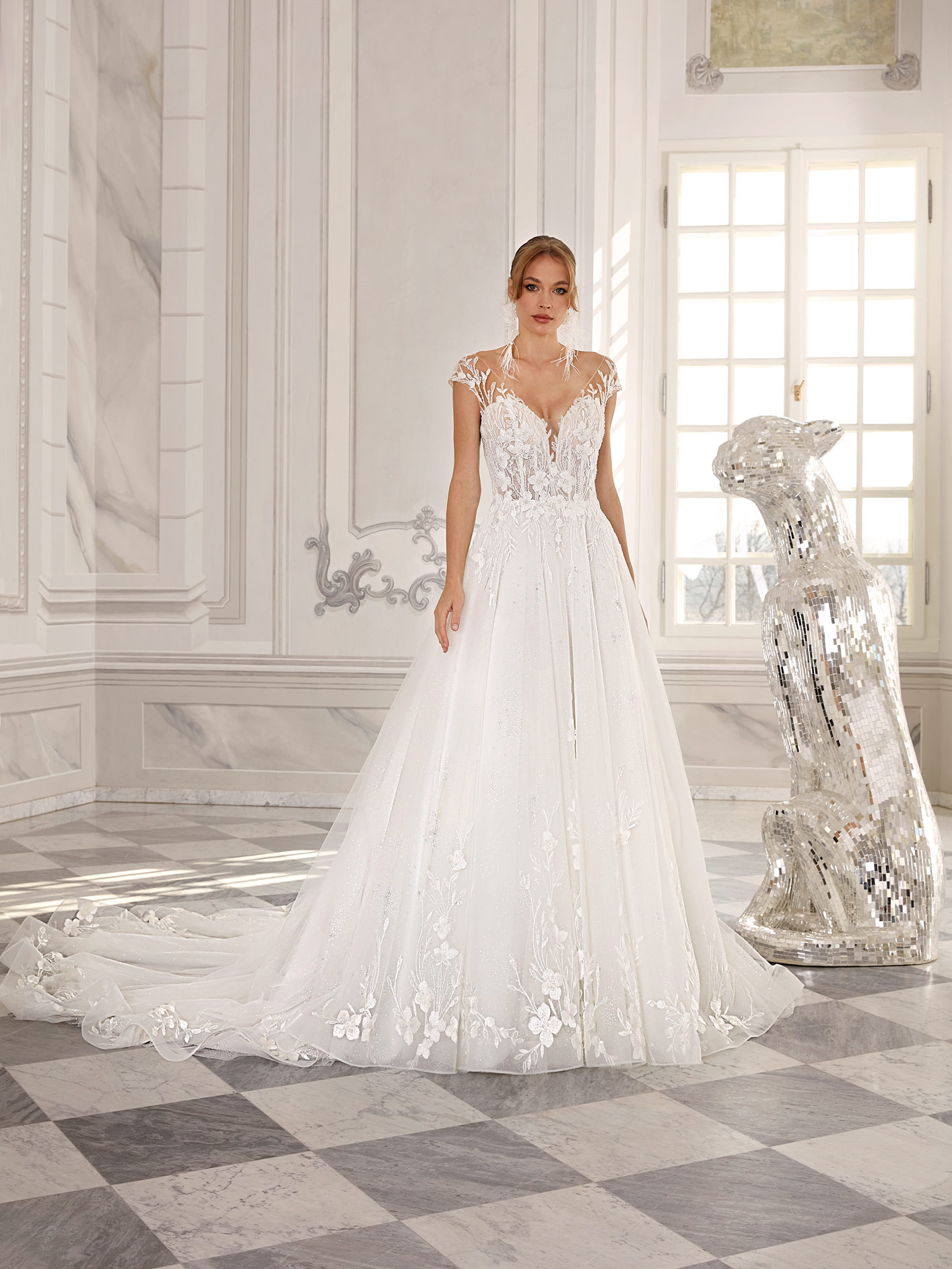 The Nellie gown features a delicate bodice with an illusion V-neckline and soft floral embroidery. The romantic embroidery flows into the airy, flared skirt with a train. The back reveals a deep illusion cut adorned with elegant appliqués.