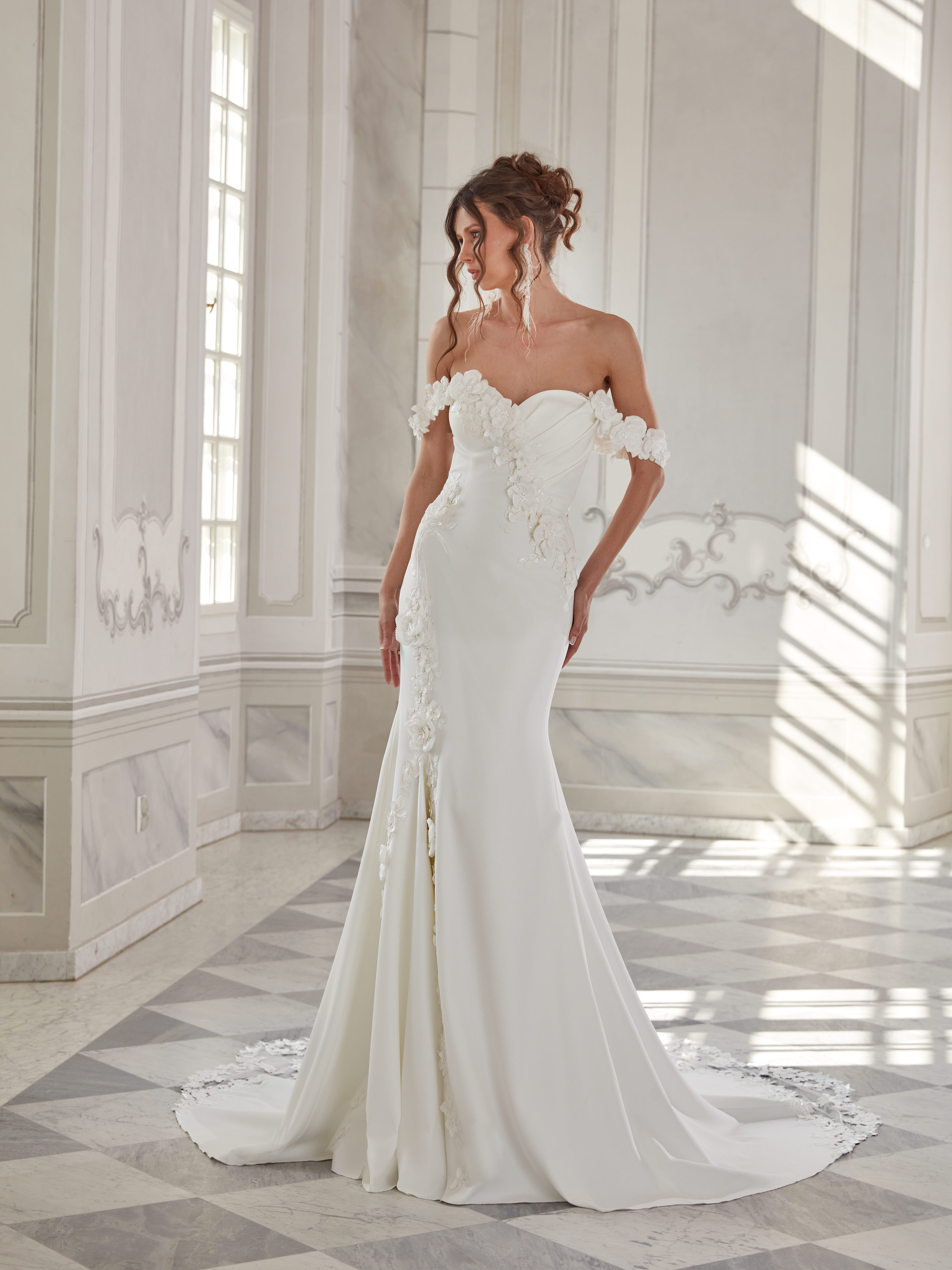 Norah is a sleek, sophisticated mermaid gown that captivates with its sculptural shape and contemporary elegance. Smooth fabric contours the figure effortlessly, while sculpted floral accents add an artistic dimension. The off-shoulder neckline and intricately embroidered train elevate the gown’s luxurious feel. A sheer back with delicate lacing brings a sensual and refined finish.