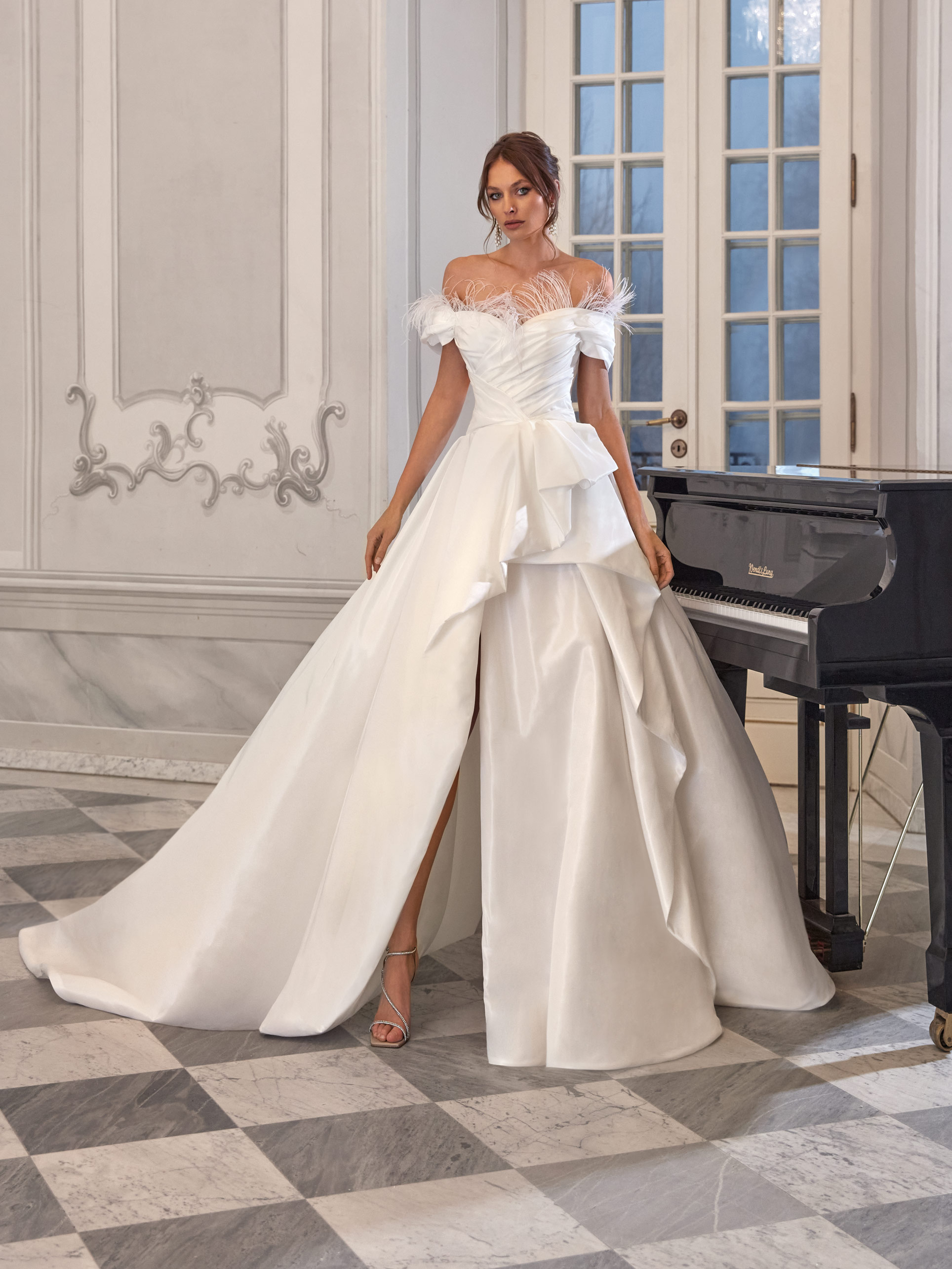 The Petra gown is a bold blend of structure and softness. Its boned bodice sculpts the figure, while the neckline is trimmed with airy feathers, adding a whimsical touch. Richly textured satin gives depth to the voluminous skirt, complemented by a daring front slit. The puffed off-the-shoulder sleeves echo a romantic spirit, while the draped bustle in the back flows into a dramatic train—perfect for a bride who loves timeless form with a modern twist.