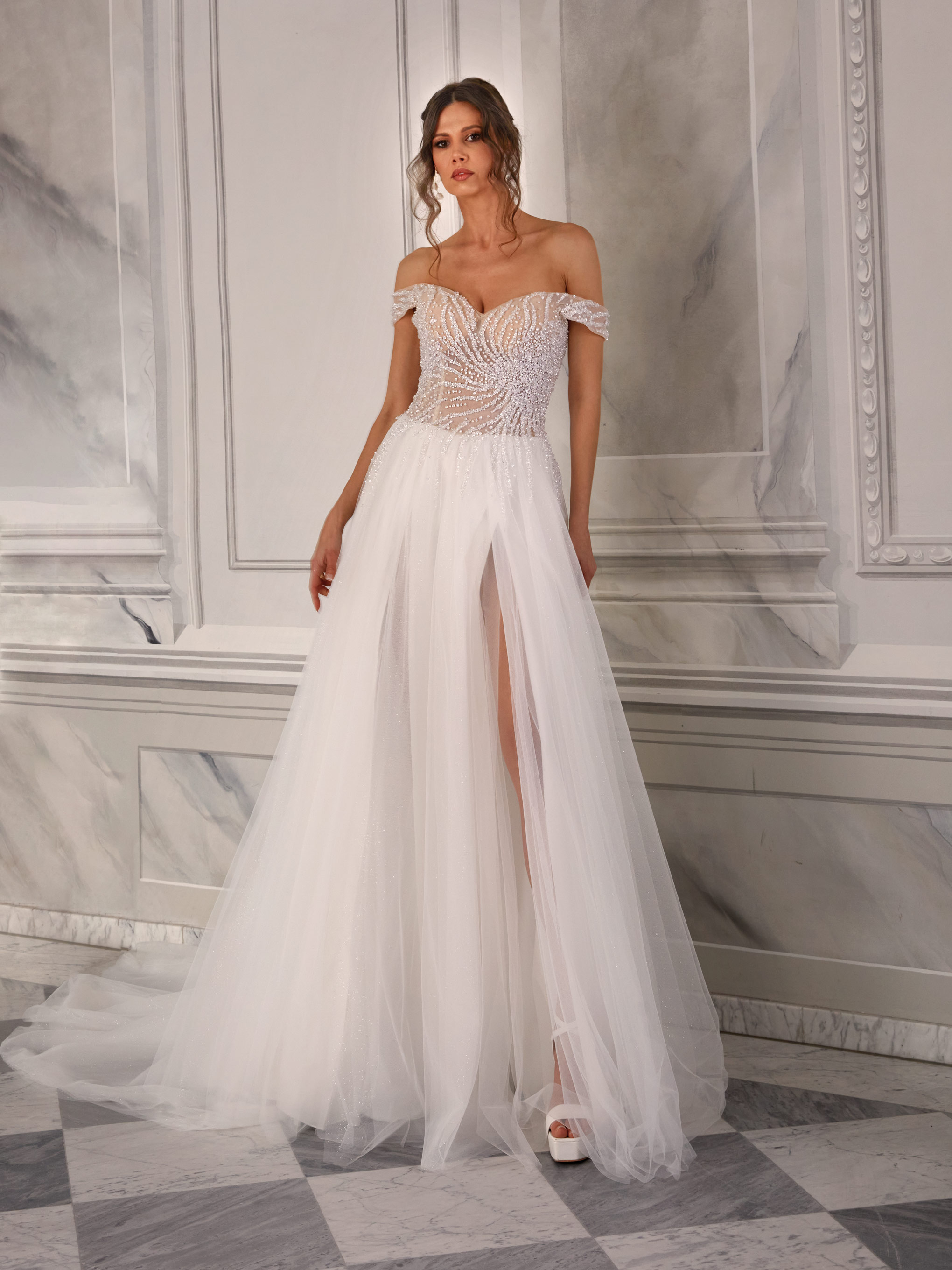 Roxanne is a sensual wedding gown that blends delicacy with modern sophistication. The off-the-shoulder bodice, adorned with intricate embroidery, gracefully highlights the neckline and shoulders, while sheer details add lightness. A thigh-high slit in the airy skirt introduces a subtly seductive charm. The long train and open back complete the look with a touch of dramatic elegance.